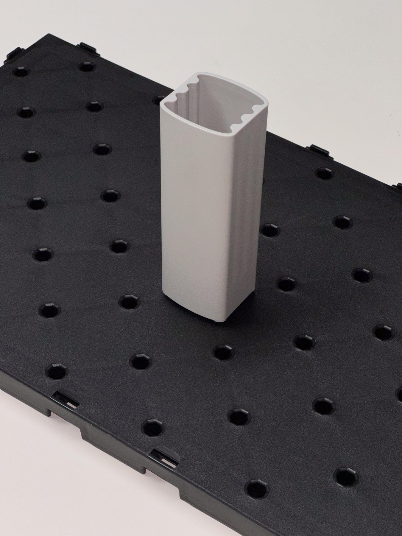 Slidestop base plates are easy to assemble and adjust as needed. Plug-in brackets are inserted into the designated holders to securely fix objects. Assembly requires no tools and takes only a few minutes.